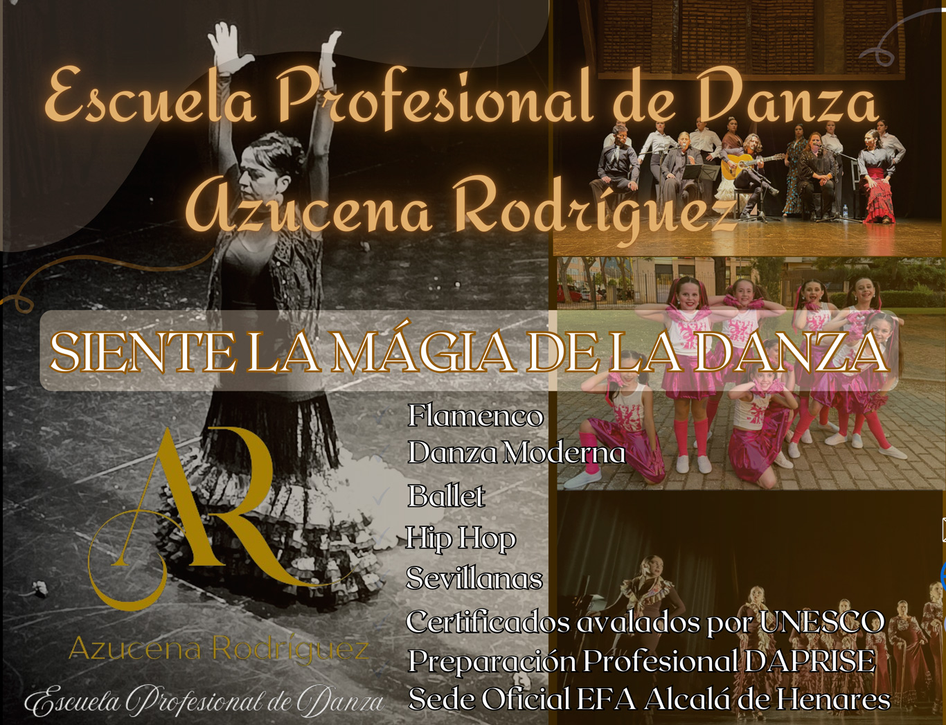 La historia de la escuela está profundamente ligada a la trayectoria de su fundadora, Azucena Rodríguez, quien comenzó su camino en la danza con tan solo 9 años. A los 14 años ya impartía clases en colegios y localidades cercanas a Alcalá de Henares, demostrando desde muy joven su vocación por la enseñanza.