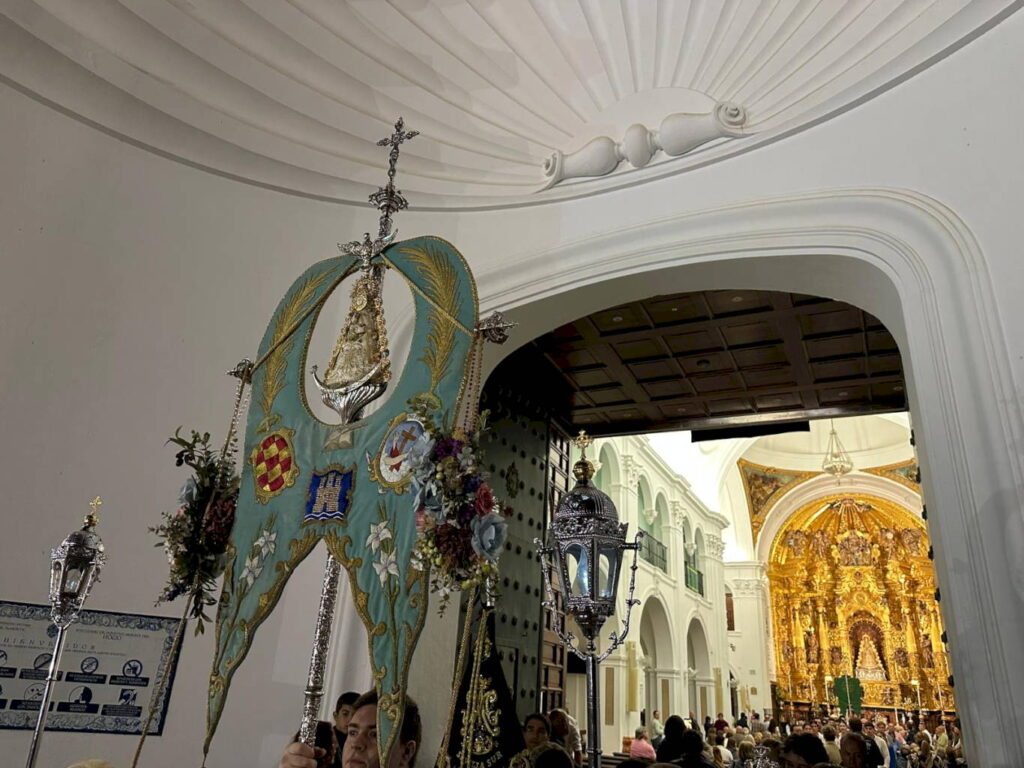 El domingo, a las 10:00 horas, la Hermandad celebró la Santa Misa en el Santuario del Rocío, donde presentó sus oraciones y ofrecimientos a la Virgen en nombre de todos los devotos de Alcalá de Henares.