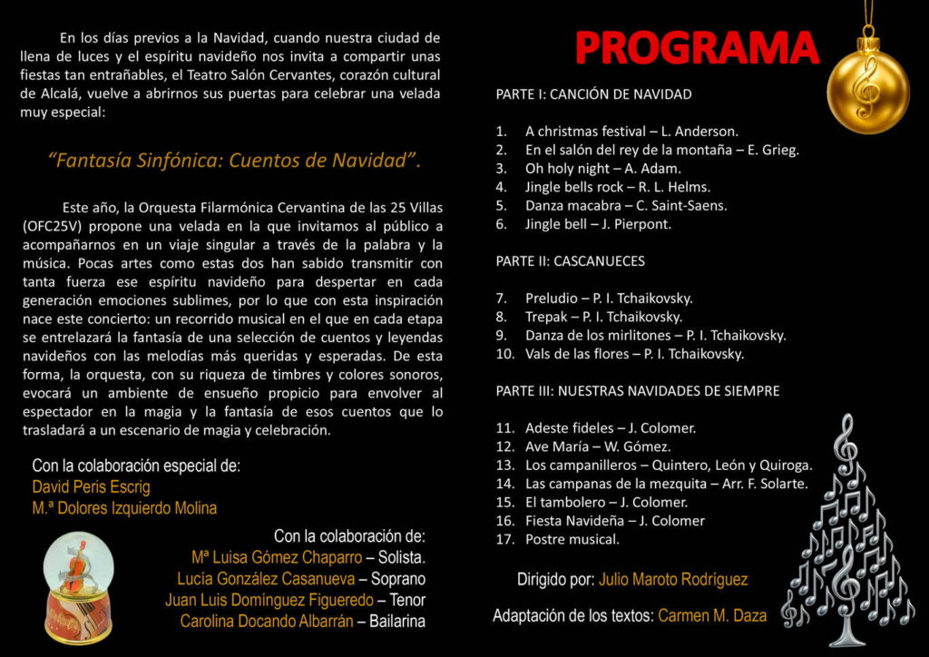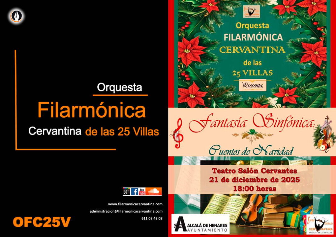 La Orquesta Filarmónica Cervantina de las 25 Villas, en los días previos a la Navidad, propone una velada que invita a adentrarnos en un mundo de fantasía y tradición: “Cuentos y Melodías de Navidad”. Una propuesta de la orquesta que convierte el escenario en un espacio de emoción y celebración.