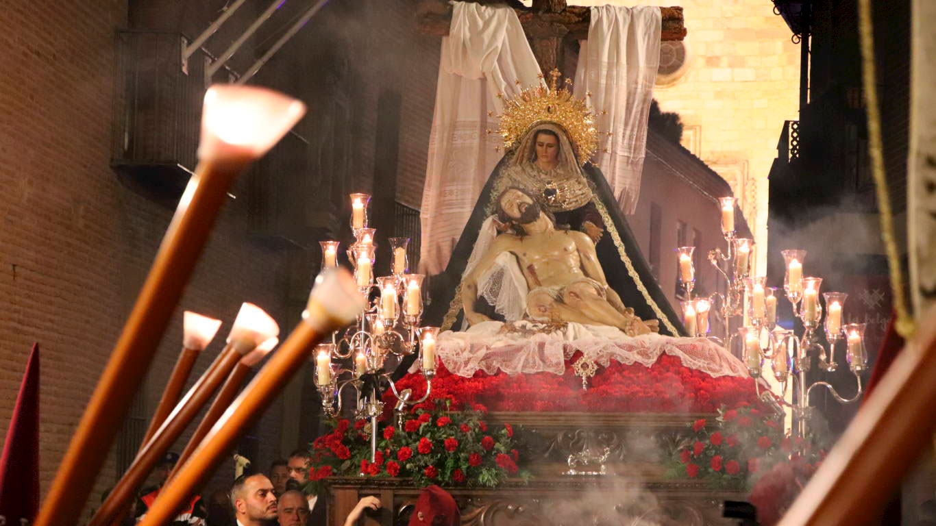 De nuevo veremos en las calles de Alcalá la talla de la Virgen sosteniendo a su hijo muerto que ha sido descendido de la Cruz. Ambas imágenes son obras del imaginero conquense D. José Antonio Jiménez de Langa.