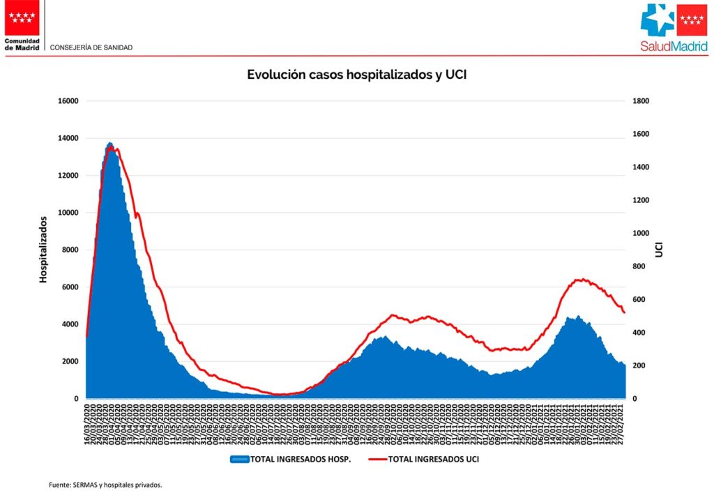Los datos de pacientes hospitalizados ya marcan cifras por debajo de los 1.800. En solo tres semanas, desde el pasado 11 de febrero (3.599 pacientes), este registro se ha reducido a la mitad. Muy lejos ya del pico de la tercera ola, que se marcó el 1 de febrero, con 4.418 personas ingresadas.