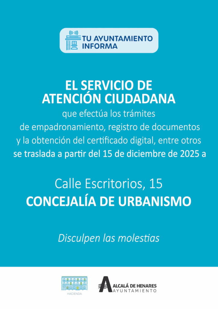 El Ayuntamiento de Alcalá de Henares ha informado del traslado del Servicio de Atención Ciudadana a la calle Escritorios, 15 (Concejalía de Urbanismo), donde comenzará a atender a partir del 15 de diciembre de 2025, con motivo de las obras en el edificio consistorial de la Plaza de Cervantes.