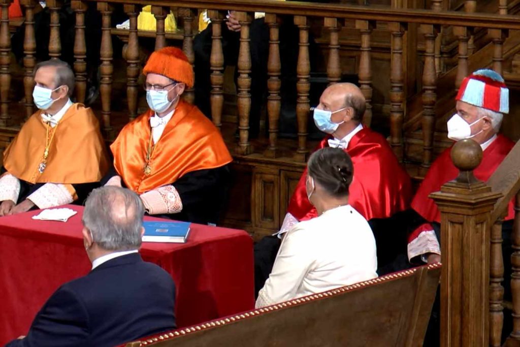 A continuación, se ha procedido a la investidura del profesor Antonio Fernández de Buján. Su laudatio ha correspondido a Juan Antonio Bueno, profesor de Derecho Romano de la UAH, que ha repasado los numerosos logros de Fernández de Buján a lo largo de su extensa carrera.