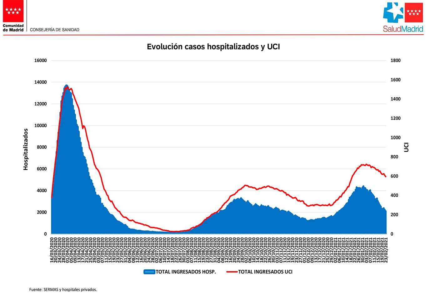 También los pacientes en UCI descienden diariamente. Si bien, lo hacen a un ritmo mucho más lento. Aún así se rompe la barrera de las 600 personas ingresadas en Cuidados Intensivos. La última vez que estuvimos por debajo de las seis centenas fue el pasado 20 de enero. Todavía los datos son muy elevados y hay que recordar que hay el doble de ocupación de camas UCI que en el mes de diciembre.