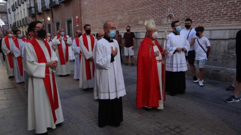 Detrás de ellas salía el paso procesionario de los Santos Niños escoltados por cuatro maceros del Ayuntamiento. Seguidamente, el cortejo de sacerdotes, encabezados por el obispo Monseñor Reig Plá, vestidos con casulla blanca y estola roja, color de la sangre y el fuego, en honor a los Santos Mártires Justo y Pastor. Por último, el acompañamiento de la Agrupación musical Sones del Tajuña de Carabaña, como ya ocurriera en 2019.