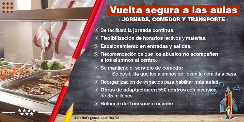 Respecto al comedor, se mantendrá el servicio ofreciendo la posibilidad de ampliar los turnos, que se utilicen las aulas como comedores o que los alumnos puedan llevarse la comida a casa. Además, el Ejecutivo va a reforzar el transporte escolar con el fin de que puedan mantener las distancias de seguridad. Además, los vehículos deberán ser ventilados y desinfectados después de cada uso y se incrementará la flota.