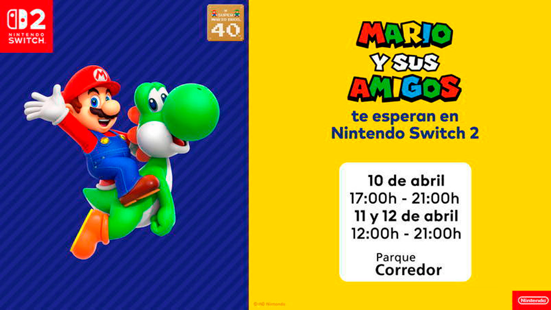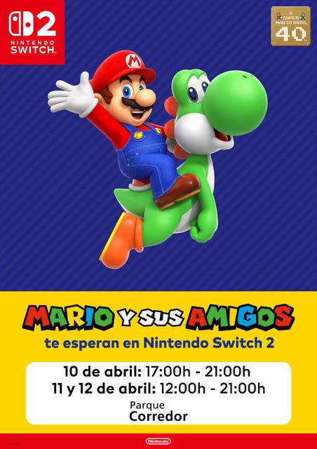 Del viernes 10 al domingo 12 de abril ven al espacio Nintendo, en el centro comercial Parque Corredor, y diviértete con Mario y sus amigos a los mandos de Nintendo Switch 2: Mario Kart World, Donkey Kong Bananza, Mario Tennis Fever, Super Mario Bros. Wonder – Nintendo Switch 2 Edition + Encuentro en el parque Belabel, Super Mario Galaxy y Super Mario Galaxy 2 estarán disponibles para que disfrutes de forma gratuita junto con tus familiares y amigos.