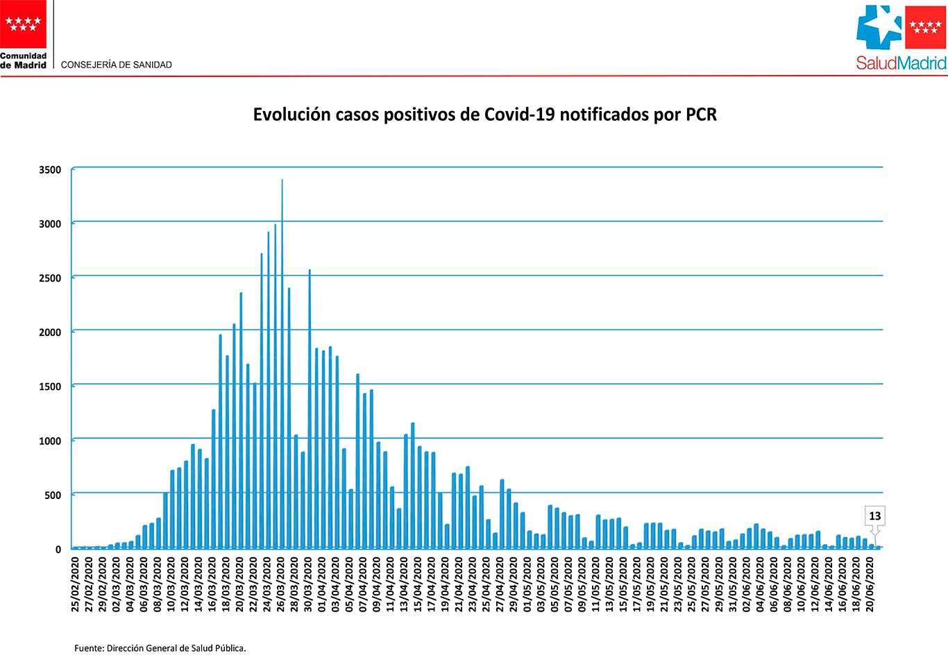 Al cierre de ayer, 22 de junio, la Comunidad de Madrid suma un total de 72.501 pacientes afectados por COVID-19 en datos contrastados con prueba PCR. Son en total 138 casos nuevos notificados incorporados, 13 de ellos notificados en las últimas 24 horas.
