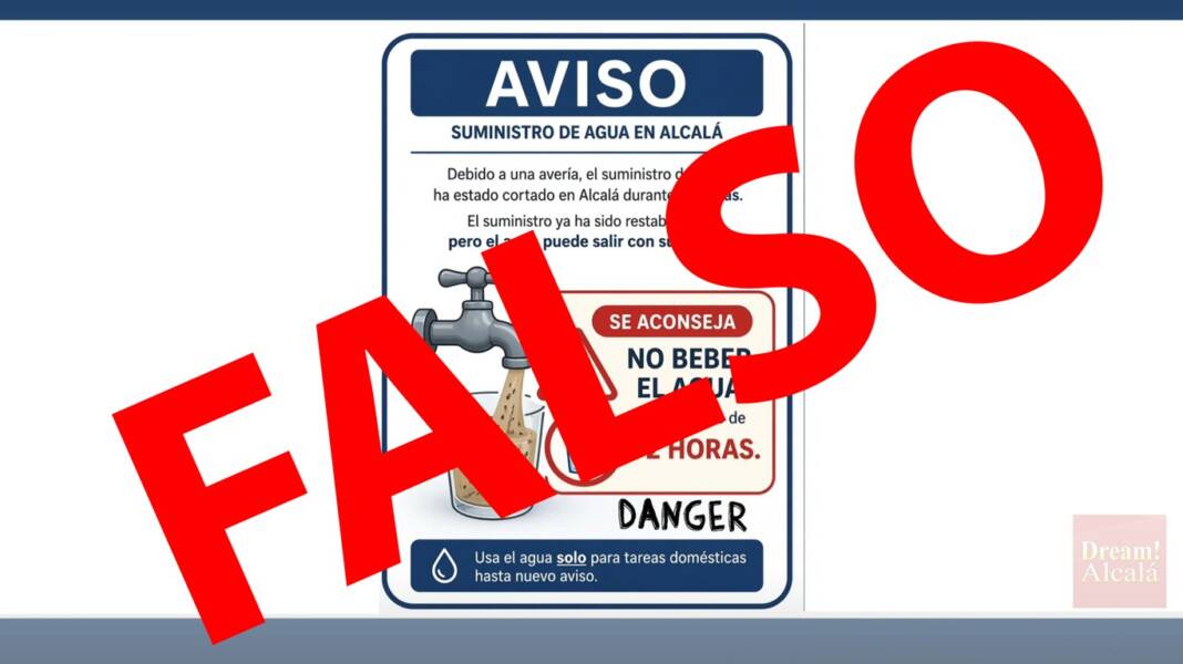 Un documento que viene sin firmar por ninguna institución responsable y cuyo encabezamiento solo habla de ‘Aviso. Suministro de agua en Alcalá’ y continúa ‘Debido a una avería, el suministro de agua ha estado cortado en Alcalá durante 48 horas. El suministro ya ha sido restablecido, pero el agua puede salir con suciedad’.