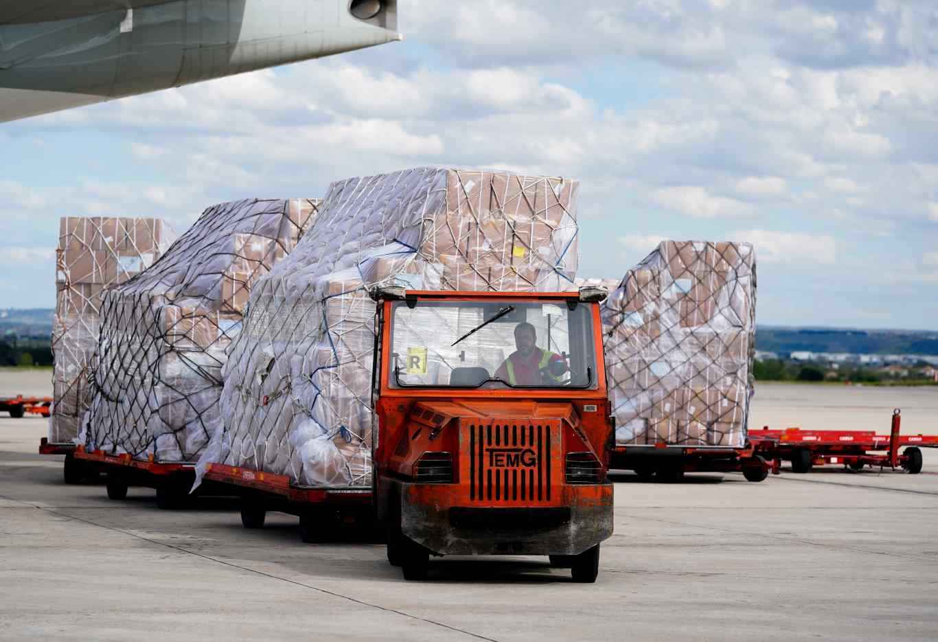 La Comunidad de Madrid ha gestionado, para agilizar los trabajos de descarga y transporte desde el aeropuerto madrileño, un equipo de 15 personas y varios camiones tráiler que se encargan de clasificar hasta 350 palets del flete del avión.