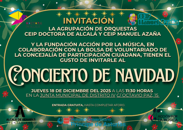 La agrupación de orquestas del CEIP Doctora de Alcalá y CEIP Manuel Azaña de Alcalá de Henares, junto al patrocinio y dirección de la Fundación Acción por la Música ofrecerá un concierto el próximo jueves días 18 de diciembre de 2025, a las 11:30 horas, en la Junta municipal de Distrito IV de Alcalá de Henares de la calle Octavio Paz, 15.