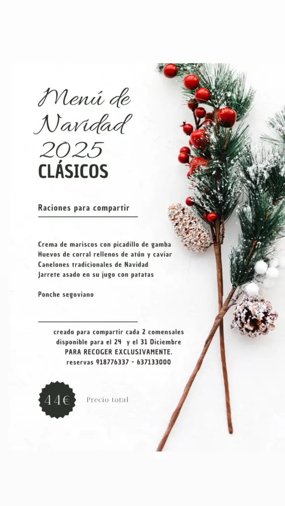 Otra suculenta opción es el Menú de Navidad «Clásicos» que reúne platos como la crema de mariscos con picadillo de gamba, los huevos de corral rellenos de atún y caviar, los canelones tradicionales de Navidad y el jarrete en su jugo con patatas, para terminar con un ponche segoviano, en un pack para dos personas por 44 €.
