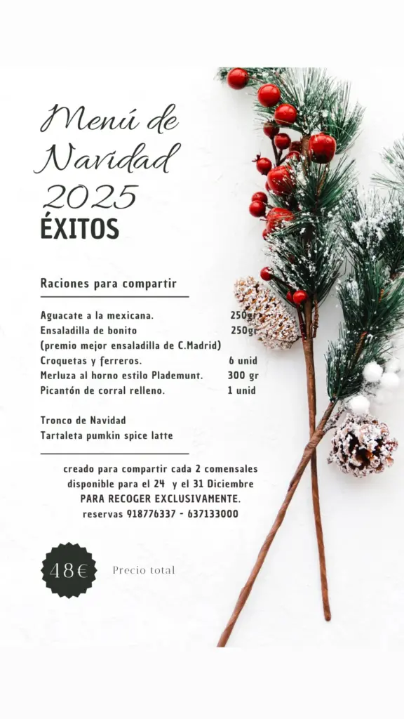 Para estas Navidades podrás elegir tres opciones. Un Menú de Navidad «Éxitos» que, en un pack para dos personas por 48 €, ofrece un variado surtido de raciones para compartir, donde figura su famosa ensaladilla de bonito (premio a la mejor ensaladilla de la Comunidad de Madrid), la merluza al horno y el picantón de corral relleno.