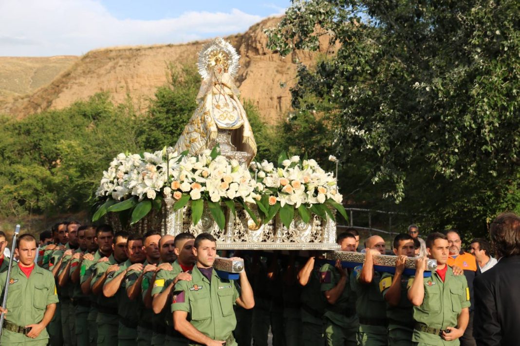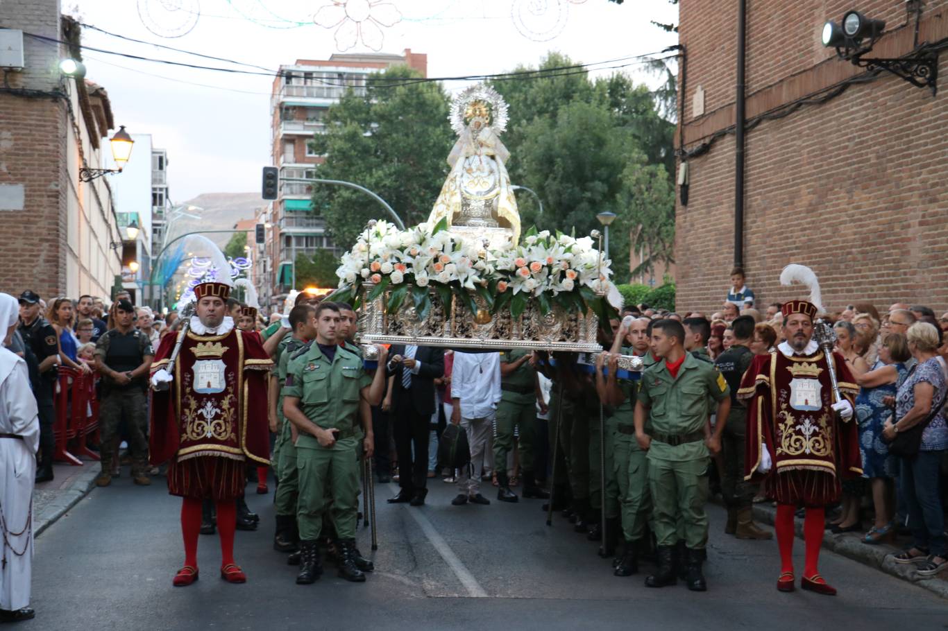 La Virgen del Val, Patrona de la Ciudad, Alcaldesa Perpetúa de Alcalá de Henares y Doctora de la Universidad de Alcalá salió portada al hombro por Damas y Caballeros Legionarios de la Brigada Paracaidista de Alcalá de Henares voluntarios de todas las unidades -de ahí la mezcla de colores de sus pañuelos-, con el acompañamiento musical militar de la Base Príncipe de la Brigada de los Almogávares VI de Paracaidistas y la escolta del del Grupo Logistico Paracaidista, con Guión (estandarte, en el ámbito castrense reciben el nombre de guiones) de esta unidad.