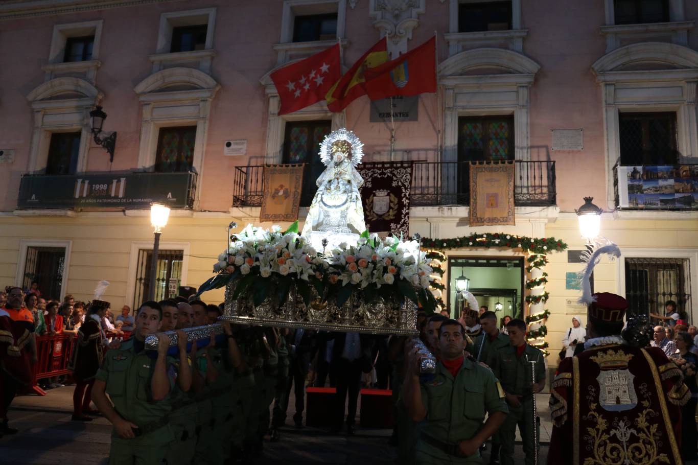 Al llegar a la plaza de Cervantes eran miles los alcalaínos y visitantes que se agolpaban en la puerta del Ayuntamiento. Nadie quería perderse el acto en el que el alcalde de la ciudad, Javier Rodríguez Palacios, hacía entrega del bastón de mando de la ciudad a la Virgen, alcaldesa perpetua de Alcalá de Henares.