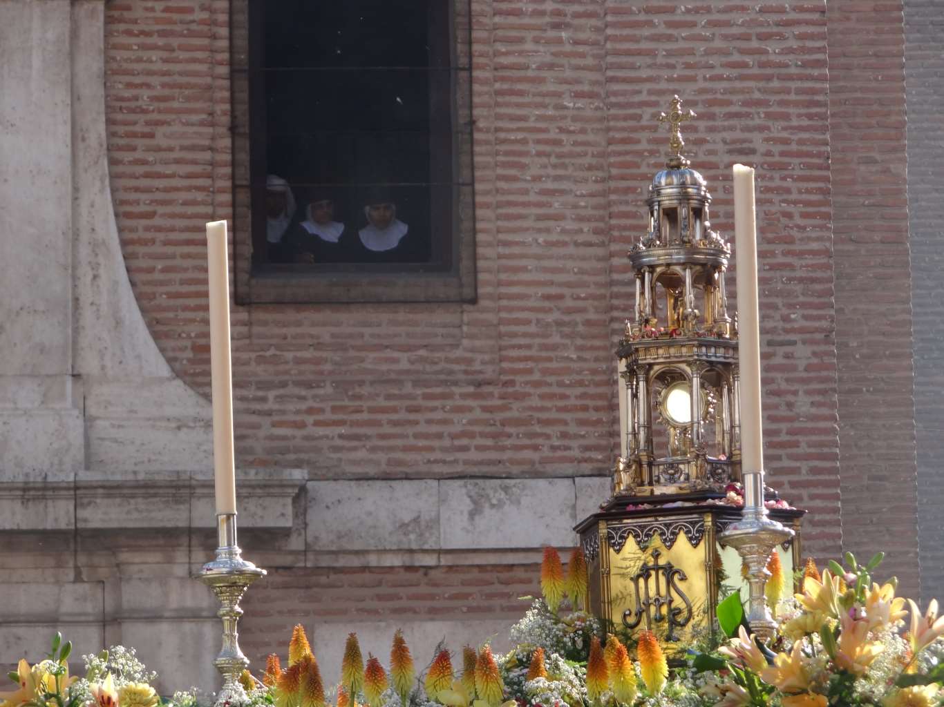 Un recorrido rápido que sin duda agradecieron los costaleros y anderos de los tres pasos que procesionaban en el Corpus 2017 de Alcalá de Henares. Rodeo a la plaza de los Santos Niños para ir directamente a Escritorios y Santa Úrsula -donde las hermanas de clausura asomaban por las ventanas del convento- y después girar hacia plaza de Cervantes. De ahí a Libreros para enfilar el destino final en Santa María la Mayor.
