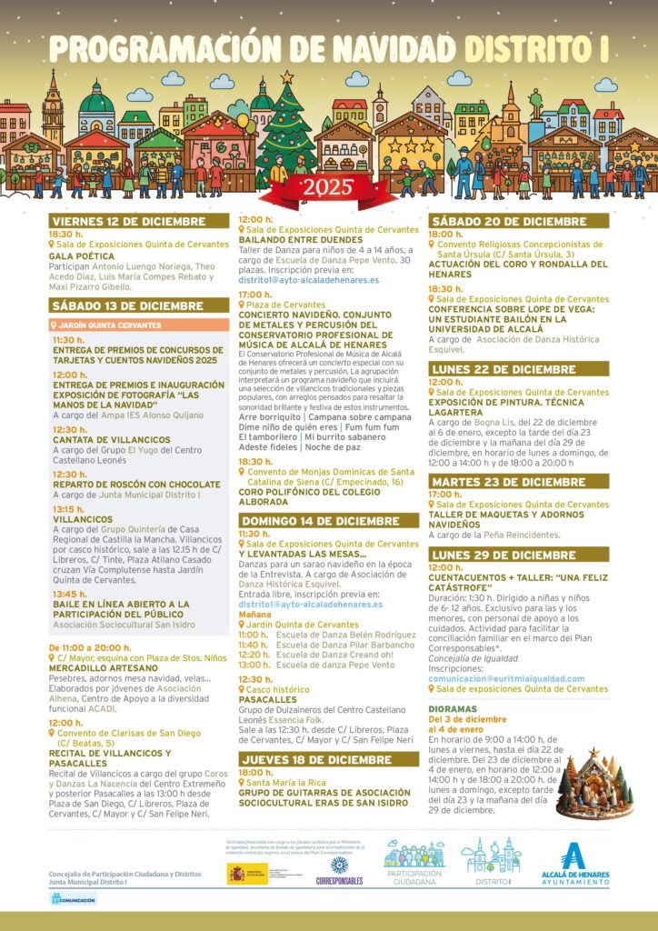 El distrito I, presidido por Víctor Cobo, propone para el fin de semana del 13 y 14 de diciembre, diversas propuestas, por un lado, en su sede, en la Quinta de Cervantes, entregas de premios, reparto de roscón o villancicos; por otro en la calle Mayor un mercadillo o en la Plaza de Cervantes o en los Conventos de las Clarisas de San Diego o de las Dominicas de Santa Catalina de Siena, diversas actuaciones musicales.