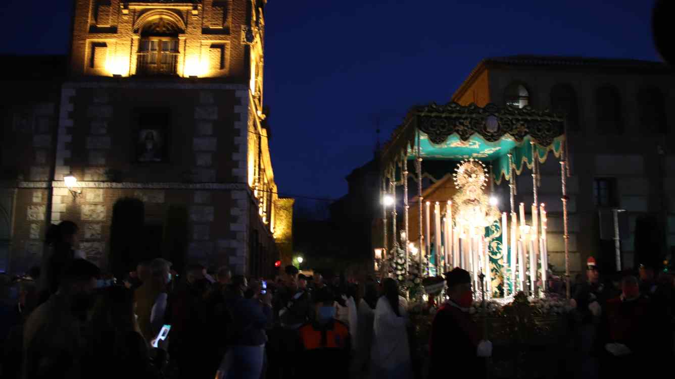 Una vez concluido el encuentro, la procesión siguió su camino por la calle Bedel para girar a la izquierda en Libreros, adentrarse de nuevo en la Plaza de Cervantes, seguir por Mayor, girar por Carmen Calzado para continuar por Santa Úrsula, para recorrer de nuevo la calle Colegios en dirección a la Ermita de los Doctrinos.