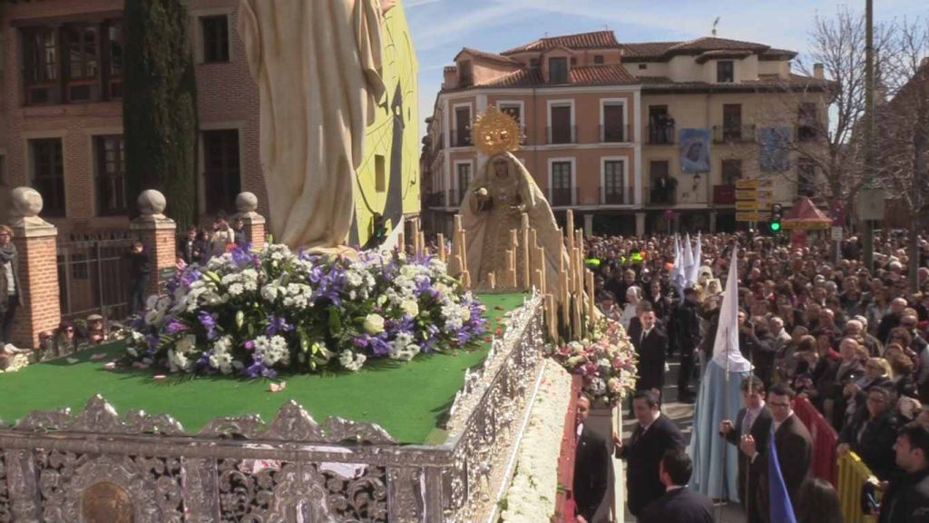Cinco minutos después de las ocho de la mañana del último Domingo de la Semana Santa de Alcalá de Henares salió de la Santa e Ilustre Catedral Magistral la Hermandad y Cofradía de Nuestro Padre Jesús Resucitado y Nuestra Señora de la Salud y el Perpetuo Socorro.