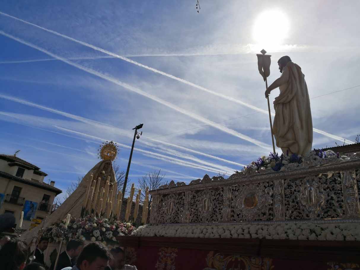 Una vez pasado el susto, y ya con el Resucitado en Santa María la Rica, Nuestra Señora enfilaba Santos Niños, con un bonito paso justo a los pies de la Catedral, pasando por la misma Plaza de Los Santos Niños y no rodeándola, para seguir a su hijo que, decían, había resucitado.