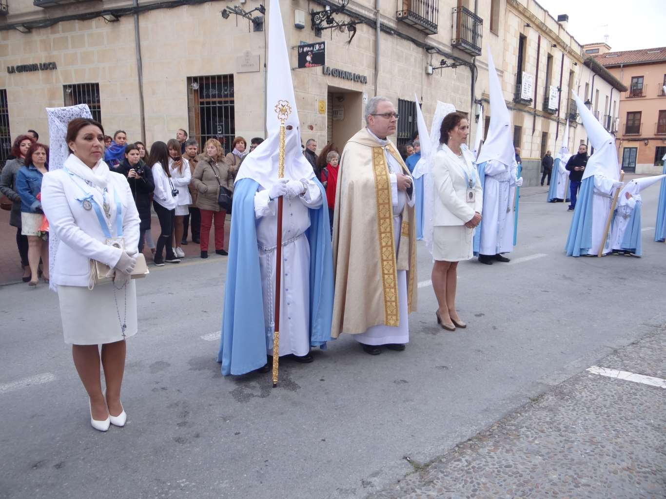 VESTIMENTA: Hábito y antifaz blanco, guantes del mismo color, cíngulo blanco y celeste, capa celeste en honor al voto concepcionista que la hermandad tiene hecho desde su fundación, calzado negro y medalla de la hermandad.