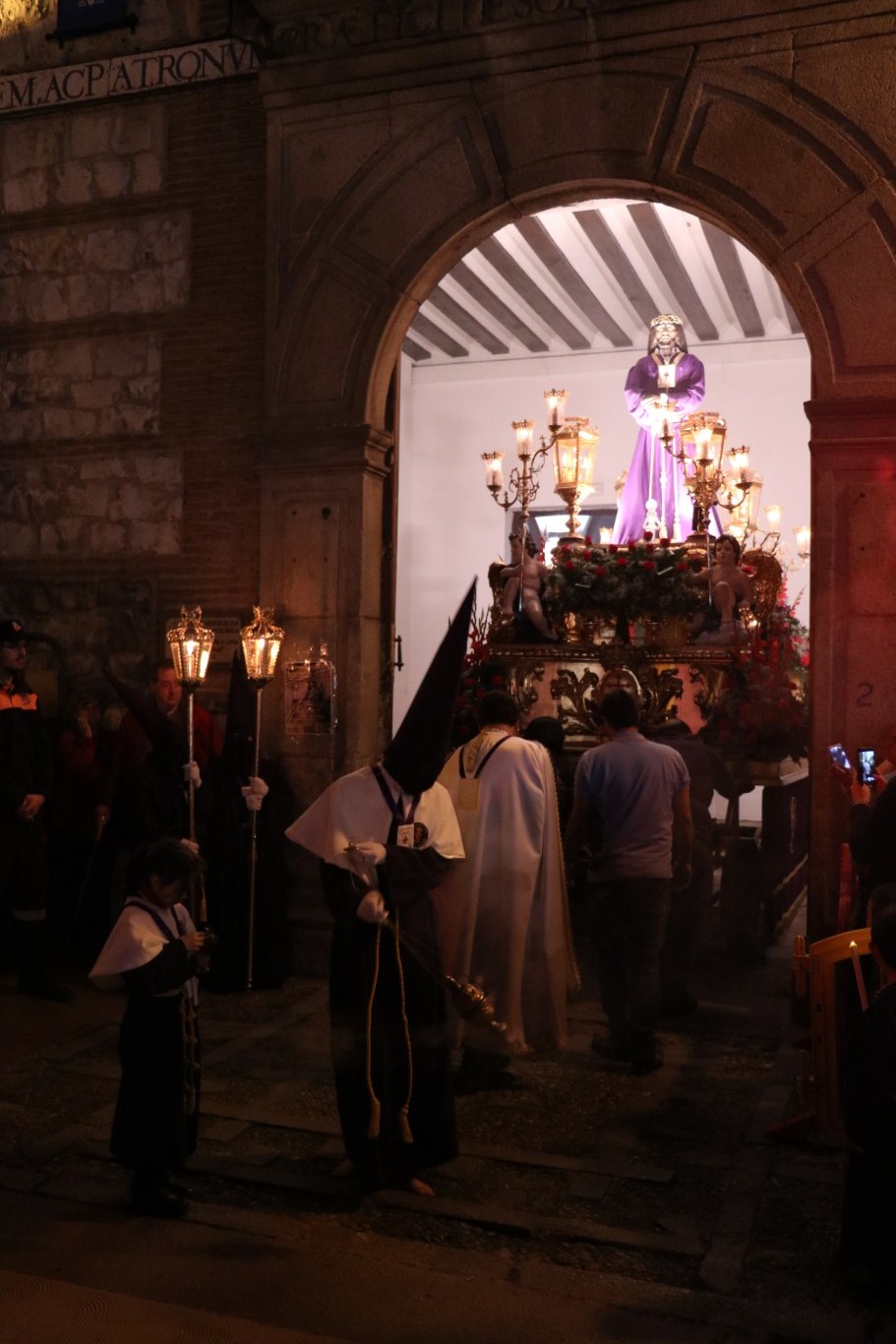 A las 20:00 de ayer Jueves Santo de 2016, en Alcalá de Henares comenzaba la procesión del Jesús Nazareno de Medinaceli y María Stma. de la Trinidad, perteneciente a la Real e Ilustre Esclavitud de N. P. Jesús Nazareno de Medinaceli y María Stma. de la Trinidad, que tiene su sede canónica en la parroquia de San Bartolomé, pero que en Semana Santa usa el excepcional emplazamiento del Colegio de Málaga de la plaza de Cervantes para iniciar su camino procesional.
