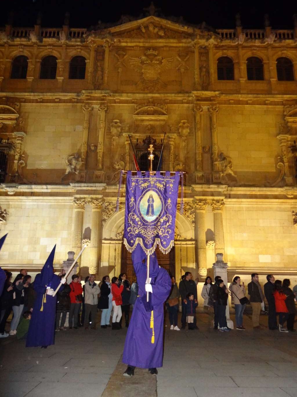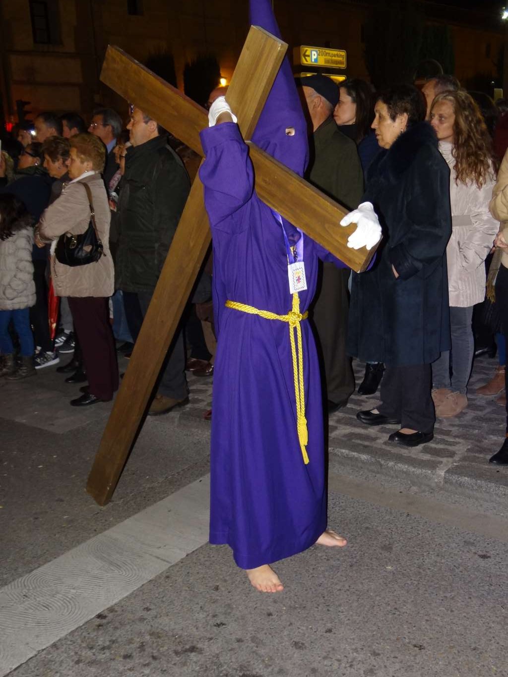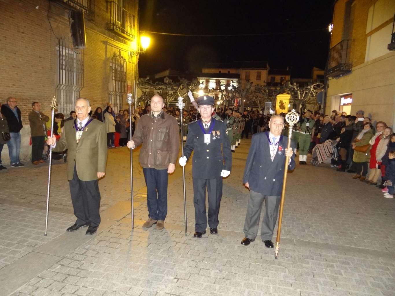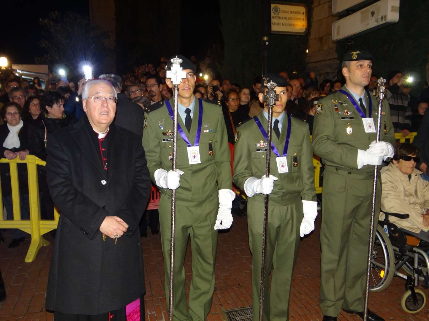 Varias escuadras de la Brigada Paracaidista, incluyendo los veteranos y sus famosos gastadores, cortejaban el paso acompañando a los nazarenos que vestidos de su inconfundible morado volvieron a llenar las calles por donde pasaba su procesión. Especial afluencia de público tuvo la Plaza de Cervantes y la Universidad, lugar donde nadie quería perderse una fotografía del Cristo de Medinaceli con la cisneriana de fondo.