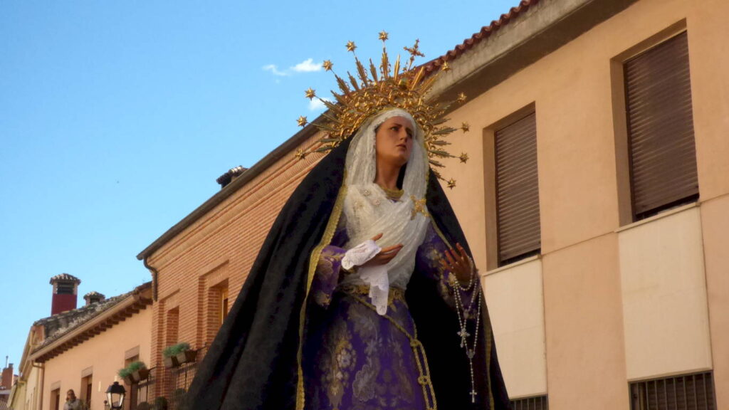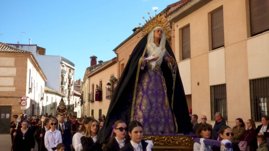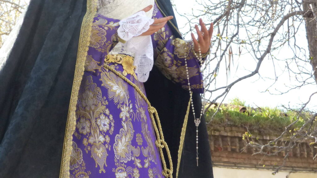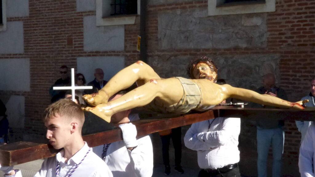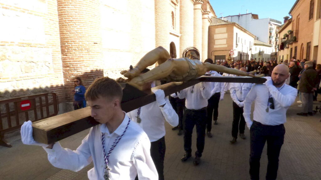 Del pórtico del convento una cuadrilla de hombres salía con el Crucificado de la Esperanza y el Trabajo, magnífica talla que dar del siglo XVII. Después, las mujeres de trono, llevaba a Nuestra Señora de la Misericordia.