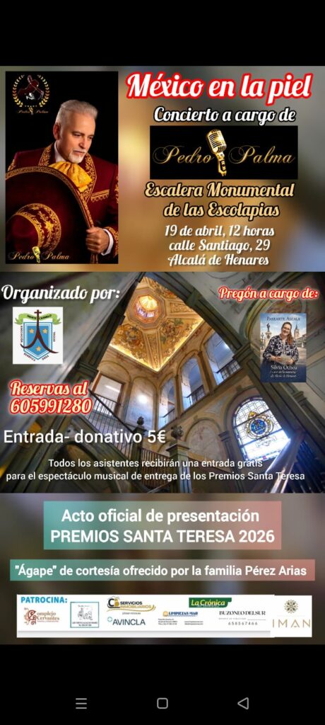 Será un acto que contará con el gran concierto ‘México en la Piel’ de Pedro Palma, y el pregón de Silvia Ochoa, conocida guía turística de Alcalá de Henares. Presentará el acto, el habitual director de la Gala de los Premios Santa Teresa, Francisco Norberto Pérez Arias.