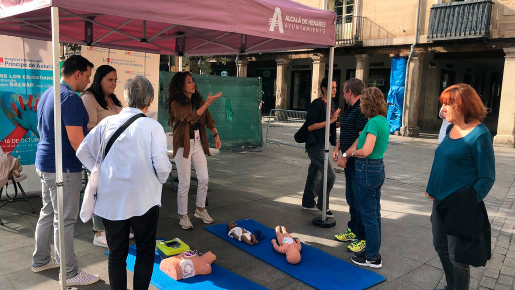 El Hospital Universitario Príncipe de Asturias se suma al Día Mundial de la Parada Cardiaca con la organización de talleres de reanimación cardiopulmonar en la Plaza de Cervantes de Alcalá de Henares.