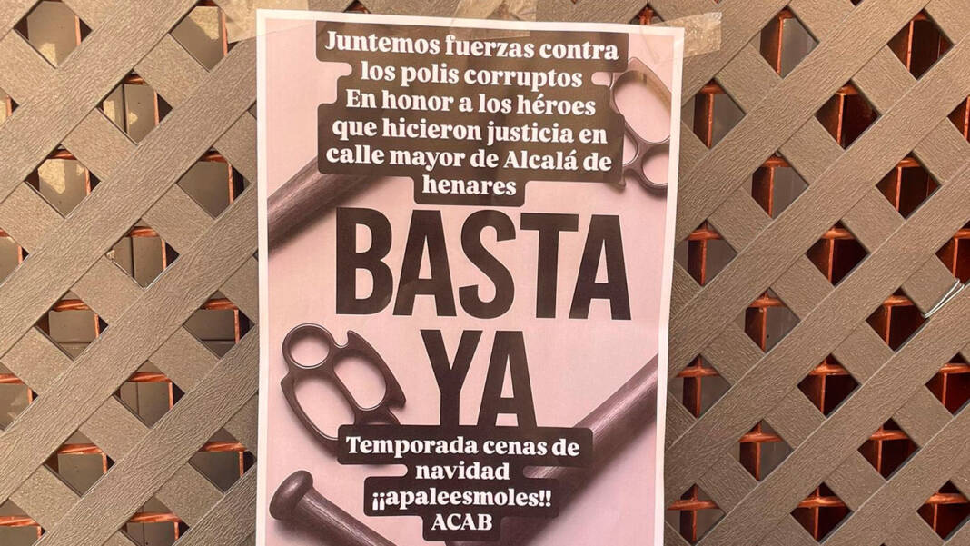 «Juntemos fuerzas contras los polis corruptos. En honor a los héroes que hicieron justicia en la calle Mayor de Alcalá de Henares. BASTA YA… Temporada de cenas de Navidad ¡¡¡apaleesmoles!!! ACAB», rezan estos carteles, con impresiones de calidad, sobre un fondo de puños americanos y porras o bates de beisbol. Para finalizar la firma ACAB (All Cops Are Bastards – ‘Todos los policías son unos bastardos’).