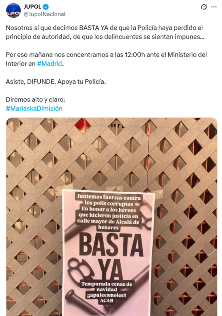 Además, tanto el sindicato Unión Federal de Policía (UFP) como Justicia Policial (JUPOL), sindicato mayoritario de la policía, denuncian en sus redes sociales la aparición de carteles en Alcalá de Henares incitando a apalear policías.