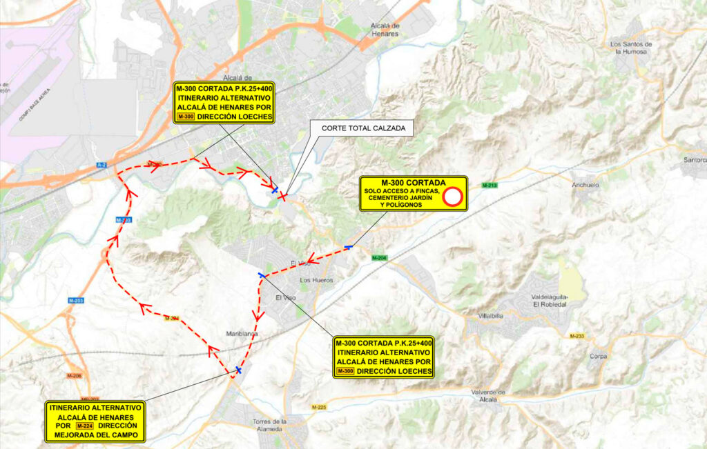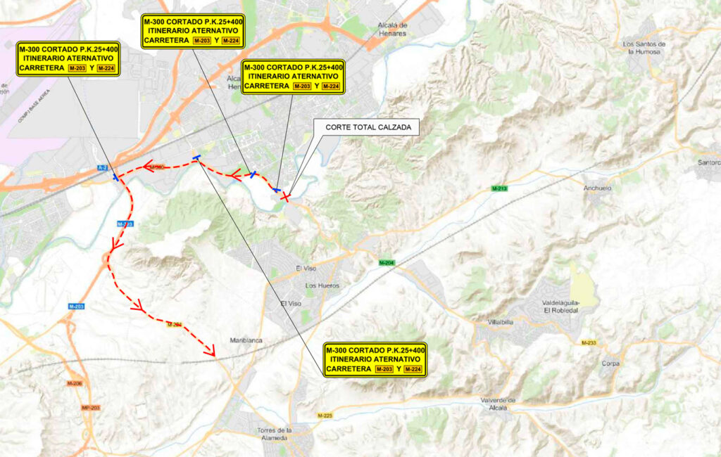 Se recomienda a los usuarios de la vía que, en sus desplazamientos, utilicen los desvíos alternativos habilitados por las carreteras M-203 y M-224 debido a las complicaciones diarias que se están produciendo en esta vía.