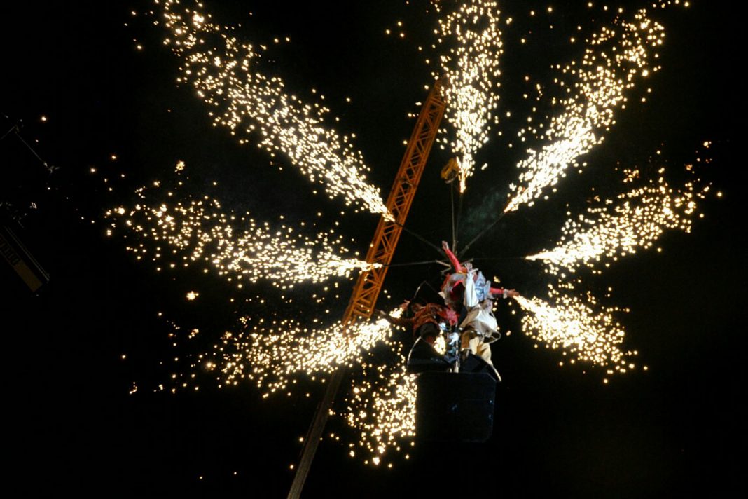 Los protagonistas de El Quijote, Don Quijote y Sancho Panza a lomos de Clavileño imaginarán diferentes locuras que interpretarán los actores suspendidos de una grúa realizando acrobacias en tela, aro y trapecio. Una voz en off orientará al público para conducirle hasta el desenlace final de fuego y pirotecnia.