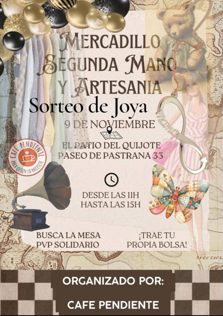 Una vez más, Café Pendiente nos invita a visitarlo este domingo, 9 de noviembre, en horario de 11:00 a 15:00 horas, y nos anima a pasar una buena mañana con buen ambiente y a buscar los llamados PVP SOLIDARIOS artículos donados (no ropa) autorizados por escrito a poder venderlos a cambio de bizum directo a uno de los comercios colaboradores de alimento fresco para poder ayudar a familias con bajos o sin recursos.