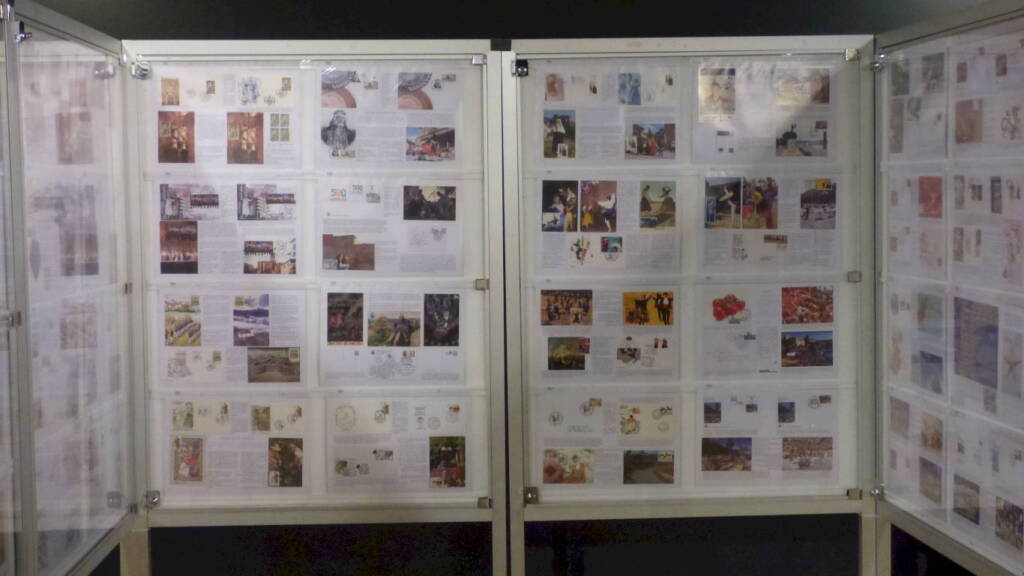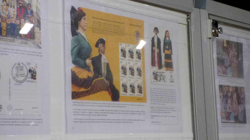 La exposición exhibe colecciones filatélicas dedicadas a la temática festiva, incluyendo colecciones de gigantes de España y del mundo, abordando diversas fiestas nacionales y del ámbito local.